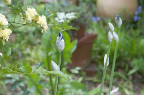 香水やポプリ作りの時、乾燥させた根茎は保留剤として利用されるイリスの蕾みの色が見え始めました。モッコウバラのアーチの側に植えているので、黄色と紫色の対比が奇麗にみえると嬉しい。